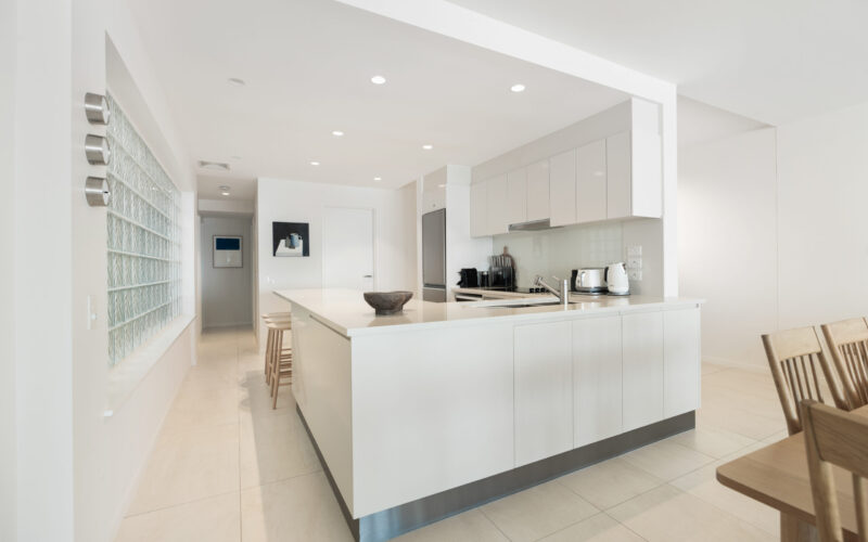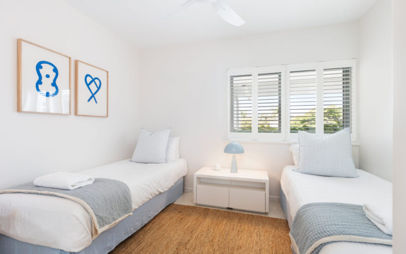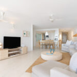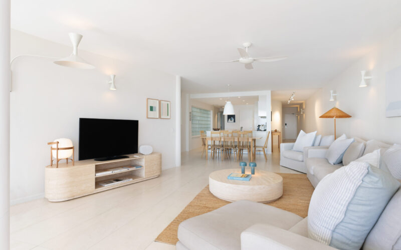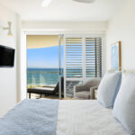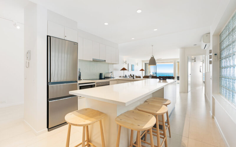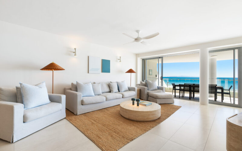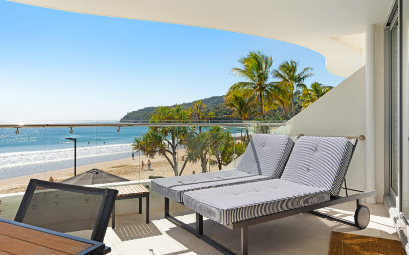 Inside, the open-plan living area frames breathtaking views over Main Beach, Double Island Point, and Noosa National Park. The two additional rear bedrooms can be configured as king or single beds, making the apartment ideal for couples, friends, or families.