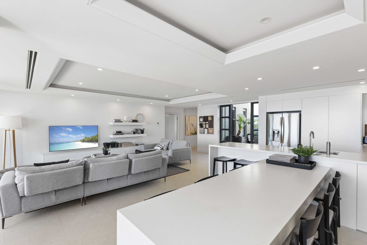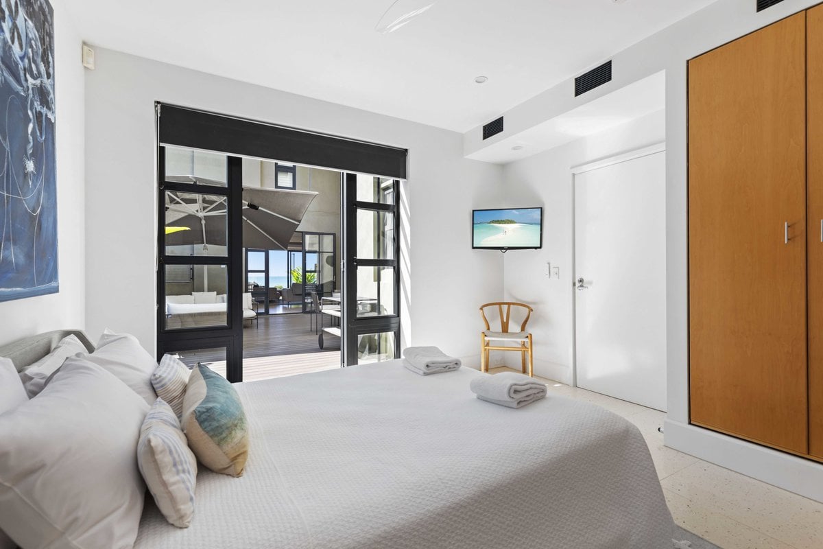 The spacious open-plan living opens onto the dining and living spaces, while the expansive glass doors open to the furnished outdoor terrace and barbecue, lawn with loungers and gardens that over look the ocean and communal complex pool